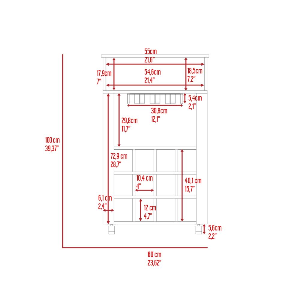 Margh Bar Cart, owning a Margh Bar Cart is like being the host with the most. Not only does this bar boast a contemporary setting and wine cellar, but it also comes equipped with twelve compartments for keeping your wine organized and fresh with twelve cubbies (4''W X 4,7''H), glassware storage, and casters (2,2'') for greater mobility. It's the perfect size for any space. So bring out your inner oenophile, and don't miss out on this must-have bar cart. Designed with elegant black wengue, carbon espresso and light grey manufactured wood finish.