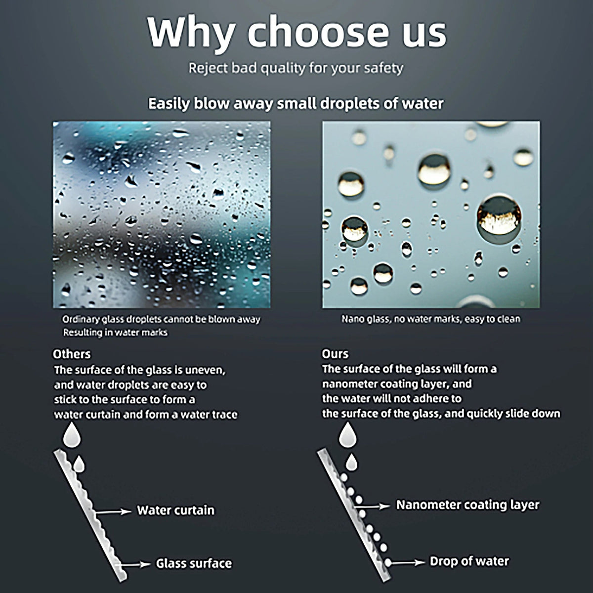 Double-sided easy-clean glass coating resists water spots, soap scum, and stains