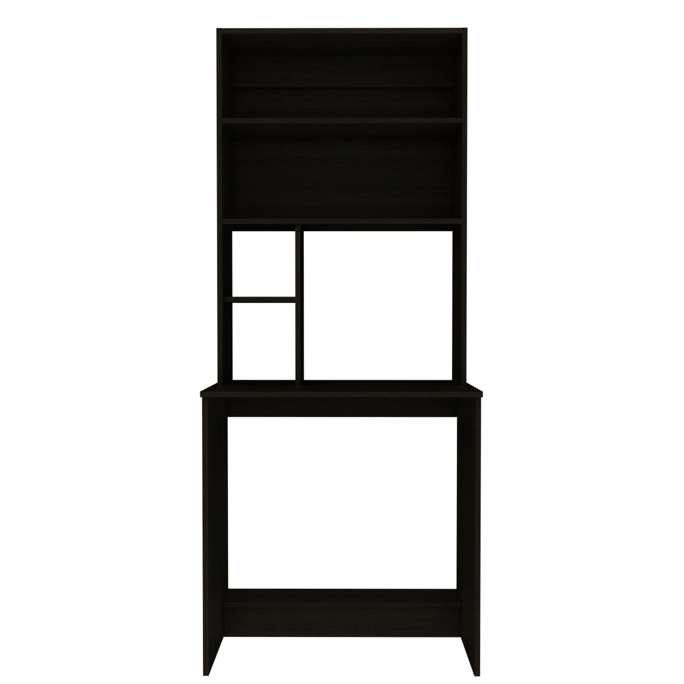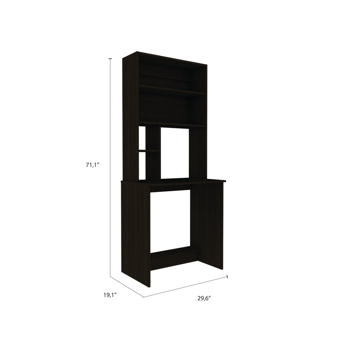 The Xalo Compu Hutch Desk is a sturdy and slim hutch Desk standing 71" tall and providing multi-level storage and organizational options. Perfect for even small spaces, Its sleek and open design is perfect for narrow spaces or a home office. Multiple shelves for storage and décor make this desk very versatile, with ample leg room. Designed with elegant black wengue, light gray, and gray oak manufactured wood finish.