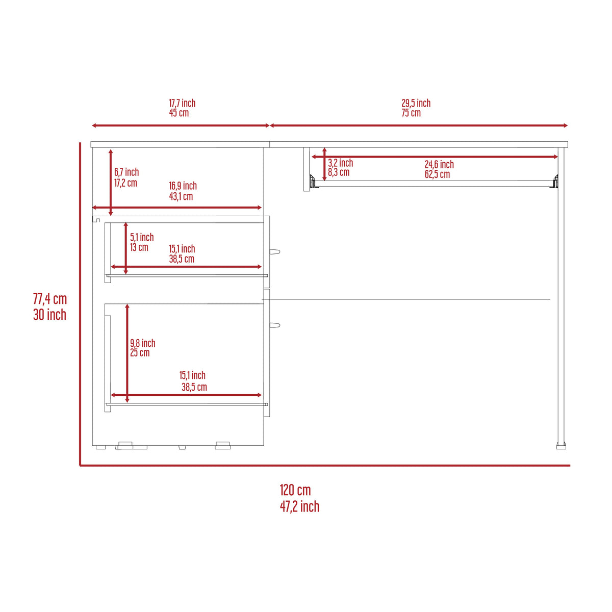 Idra L-Shaped Desk, do you need more room to spread out and get things done? This computer desk is perfect for small spaces because it fits nicely into a corner. But don't let its size fool you. This desk is packed with features. It has two drawers for storing supplies and papers, open shelving for displaying books and Decor, an ample work surface (41,3''W x 47,2''D), and a retractable keyboard tray so you can type in comfort. Designed with elegant light gray, gray oak, and black wengue manufactured wood finish.